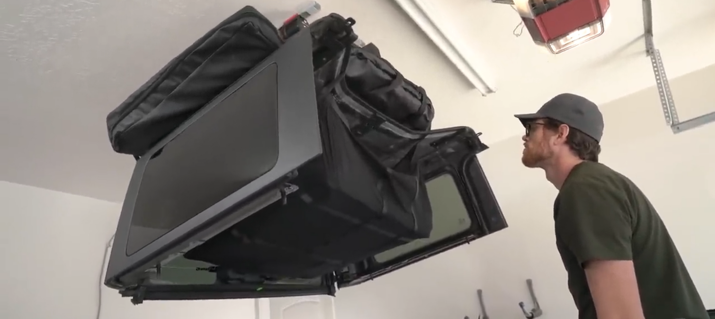 To ensure that your hard top will fit in the space desired, measure the height of your Wrangler hard top (B). Take the height of your hard top and add 12in (A) to find the exact overhead clearance.