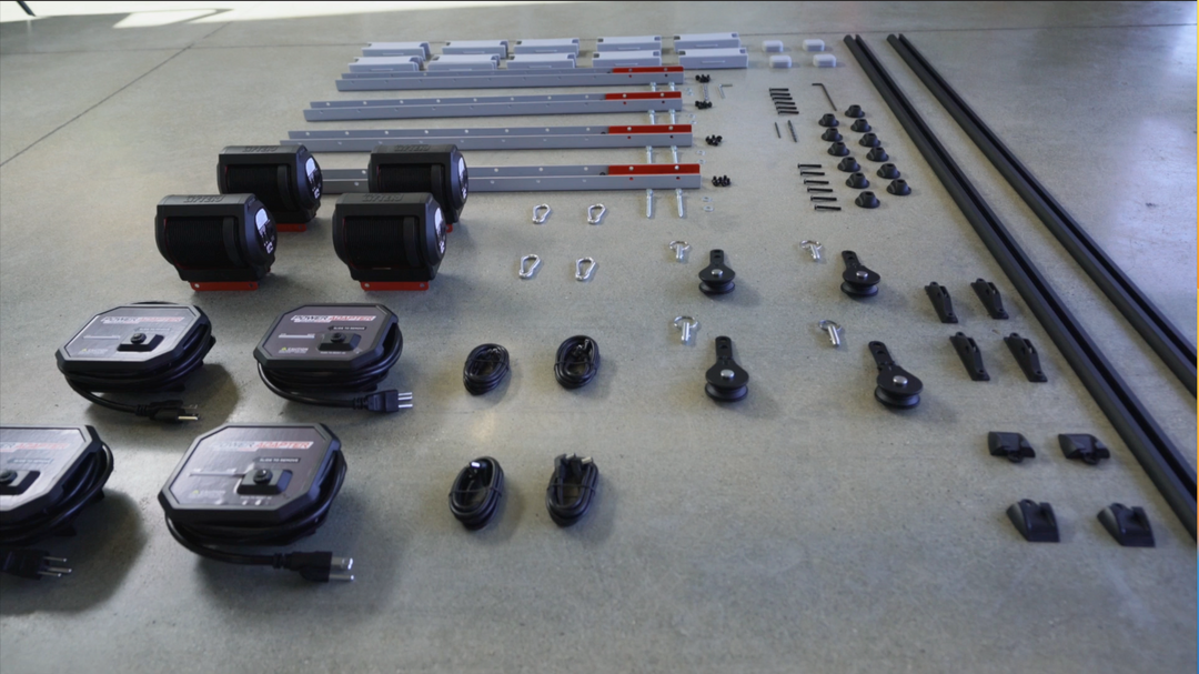 4x MyLifter, 4x Power Adapter, 4x 3' DC Cables, 4x Smart Track, 4'x6' Platform Frame and Misc. mounting hardware.