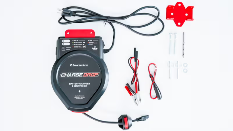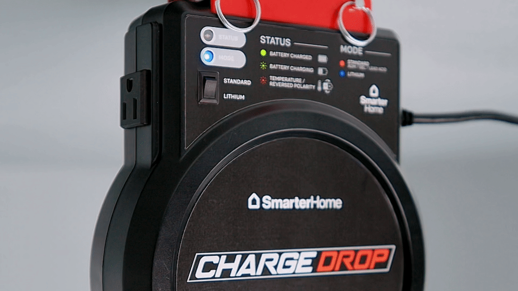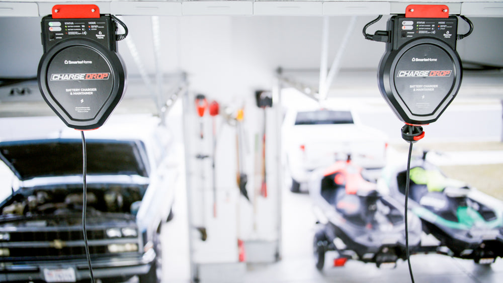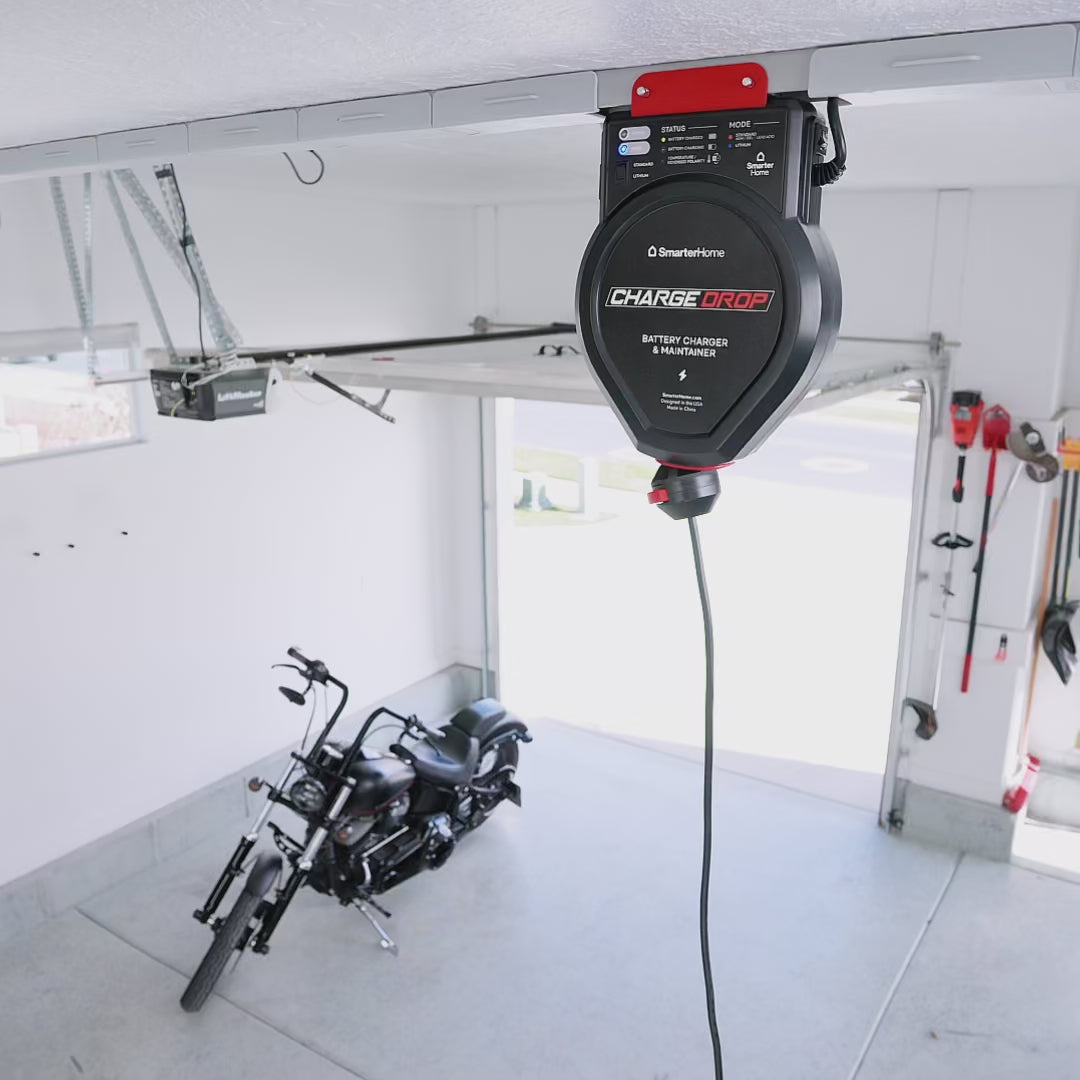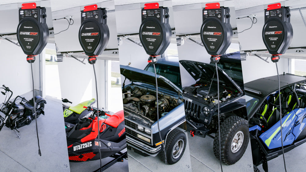 The Charge Drop is the perfect solution for keeping the starter batteries topped off in the toys/vehicles you have in your garage. The charging cable pulls down quickly when you need it, and reels back up and out of the way when you are done. You can use one and move it around to different things as needed, or you can get a dedicated charger for each and leave them connected until you are ready to go. The built in maintainer only charges the battery when it needs it, and a switch lets you choose between Lithium and lead based batteries.