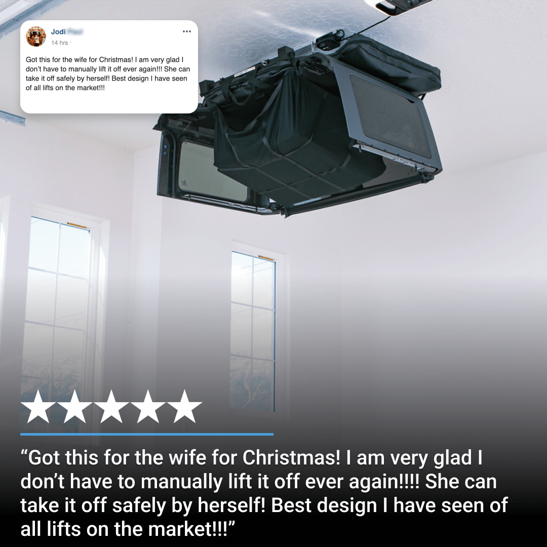 The Hard Top Lifter keeps your hard top safe by lifting from several points with a cargo net that wraps around both sides of your hard top. The cargo net fits under your hard top and is the perfect place to store the roof panels to keep them off the ground.