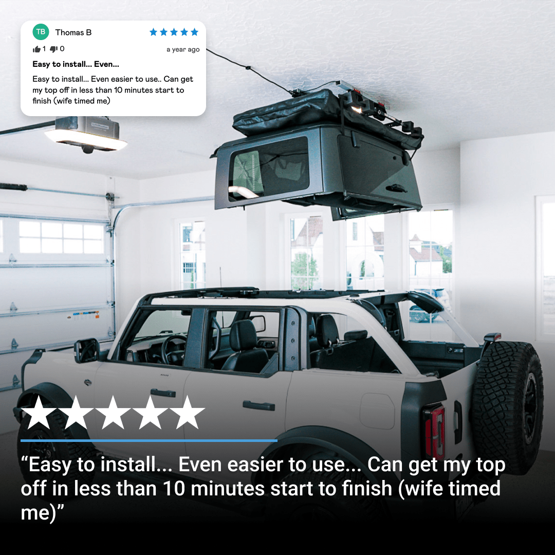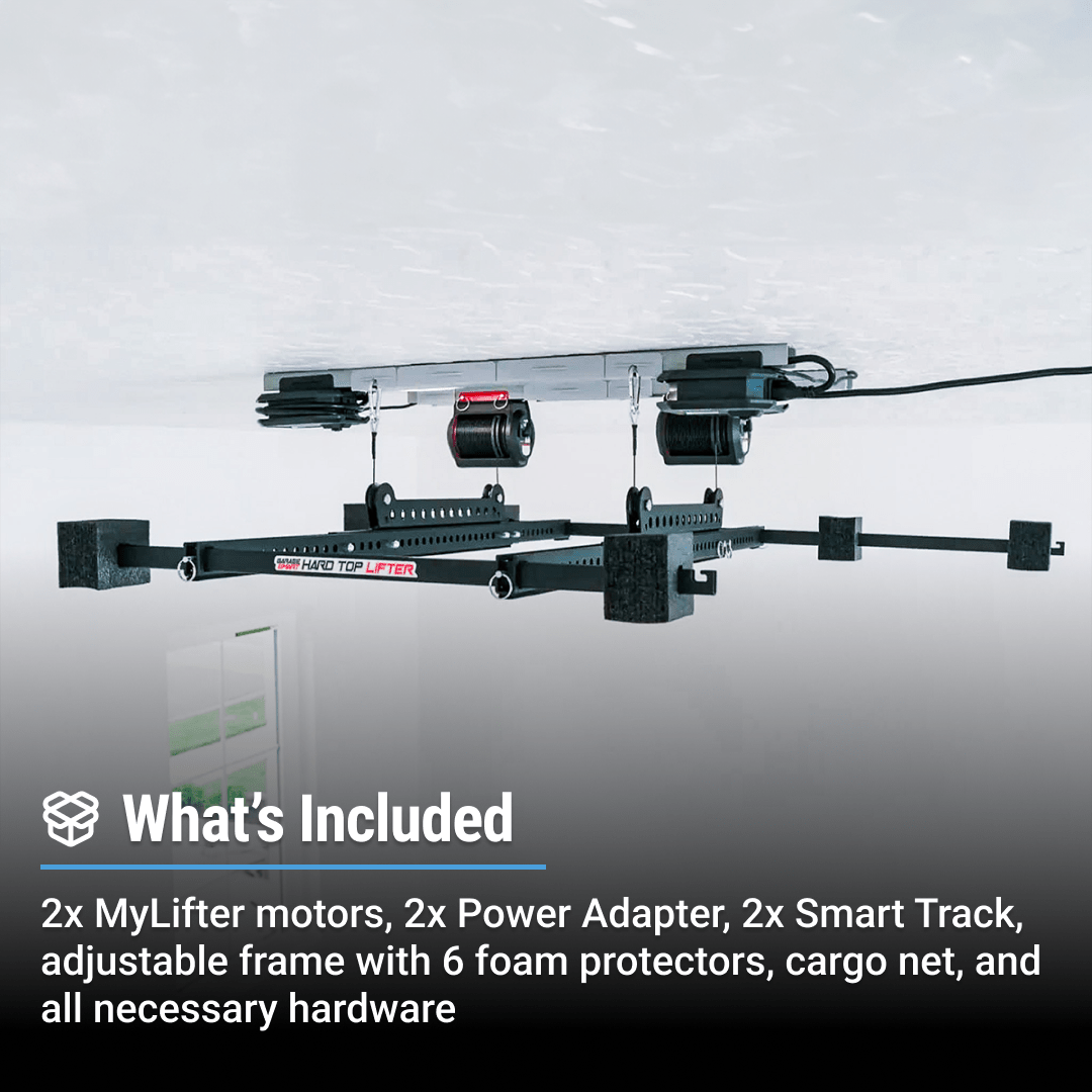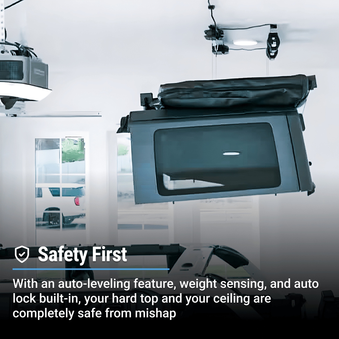 The MyLifter is the smartest and safest overhead storage motor. Period. With advanced features like weight sensing, overload protection, multi motor syncronization, Smart Stopping points, speed control, and a built in automatic lock, there really is nothing else like it. The Hard Top Lifter includes two MyLifter motors that work seamlessly together to hoist and store your hard top.