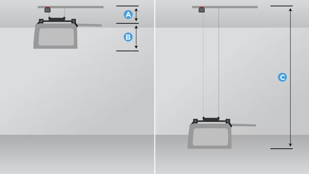 To ensure that your hard top will fit in the space desired, measure the height of your Wrangler hard top (B). Take the height of your hard top and add 12in (A) to find the exact overhead clearance.