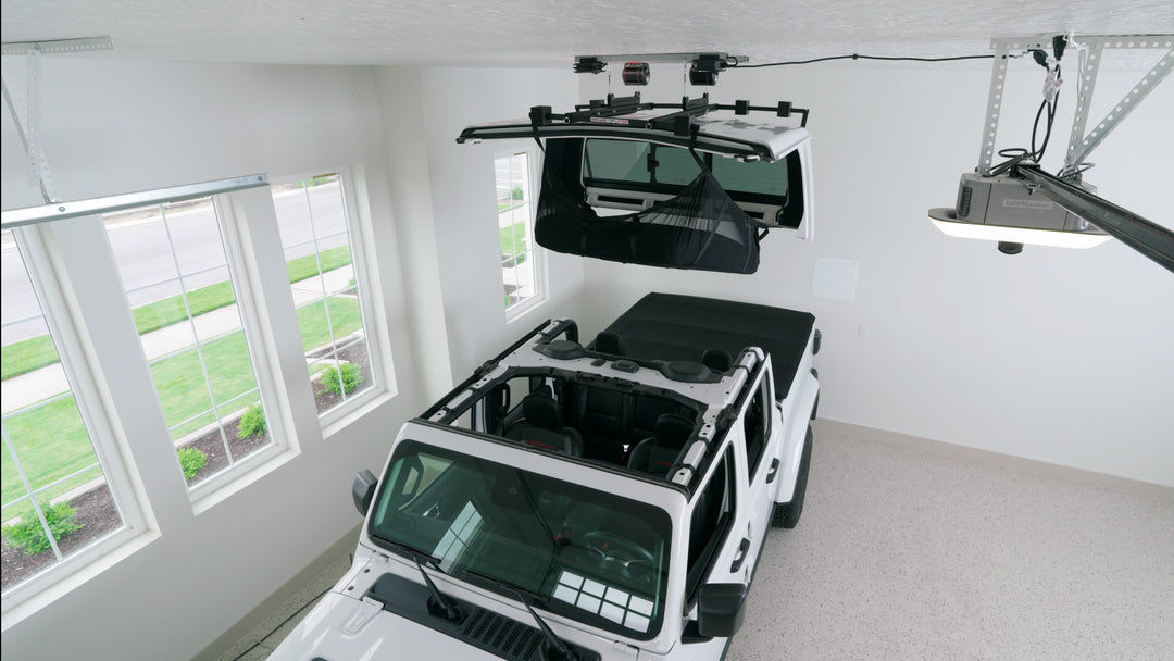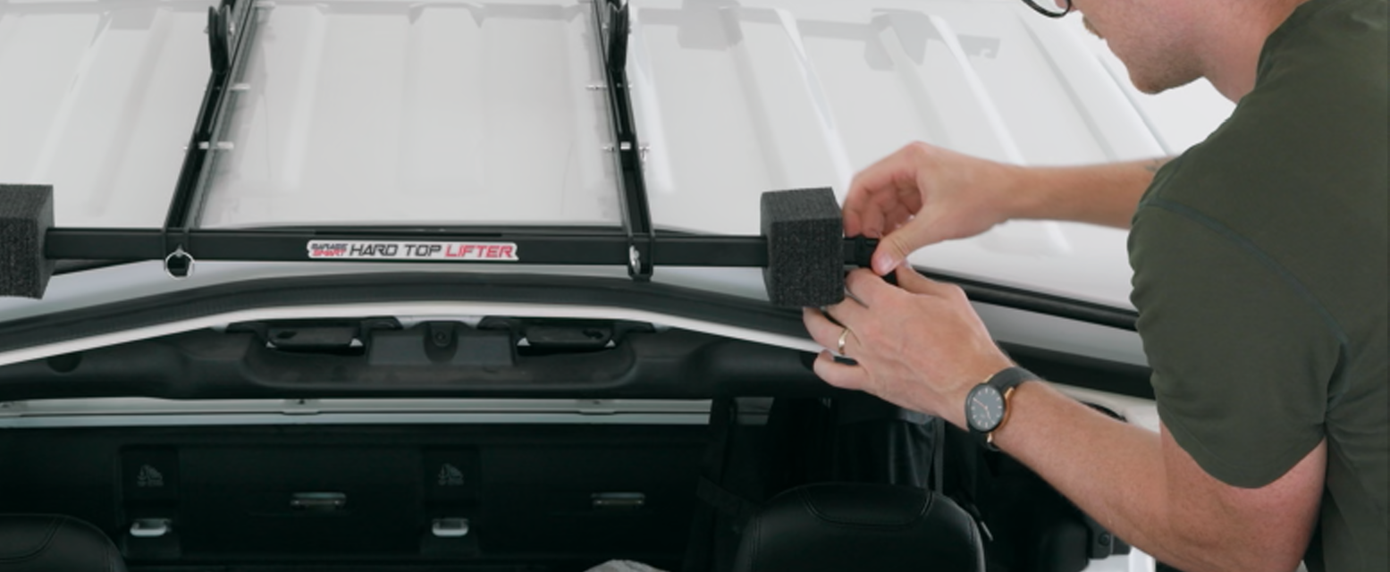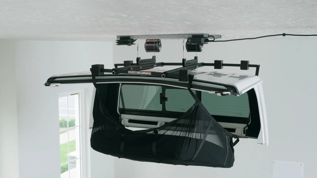 The Hard Top Lifter keeps your hard top safe by lifting from several points with a cargo net that wraps around both sides of your hard top. The cargo net fits under your hard top and is the perfect place to store the roof panels to keep them off the ground.