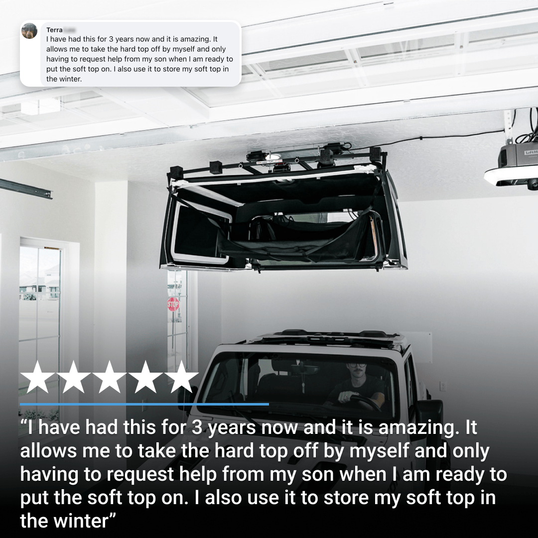 The Hard Top Lifter keeps your hard top safe by lifting from several points with a cargo net that wraps around both sides of your hard top. The cargo net fits under your hard top and is the perfect place to store the roof panels to keep them off the ground.
