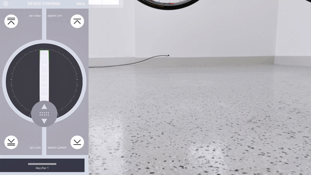 The MyLifter app’s “Smart Points" feature allows you to create automatic stopping points at your ceiling and floor. A single button press in the app automatically moves the item to the programed points.