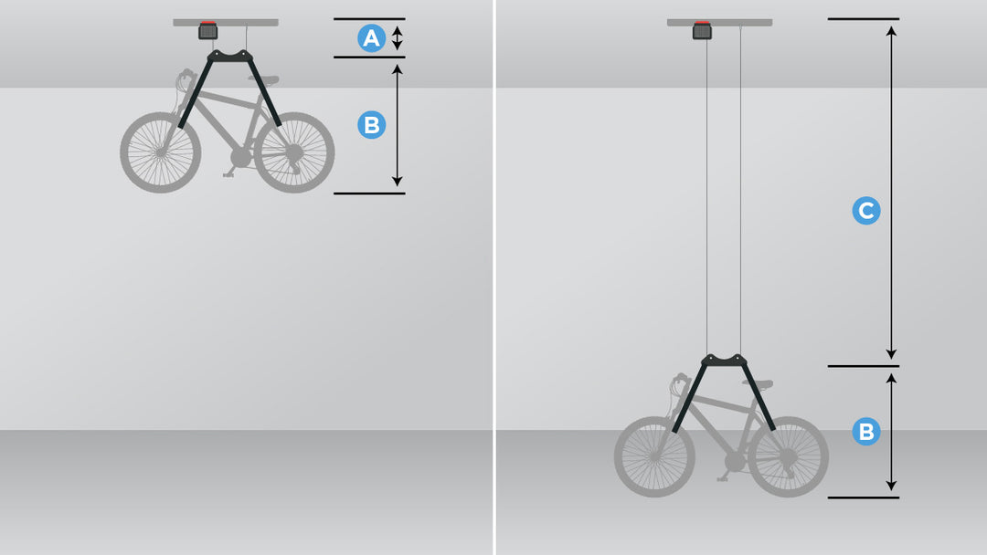 To ensure that your bikes will fit in the space desired, measure the height of your bikes (B). Take the height of your tallest bike and add 12in (A) to find the exact overhead clearance.