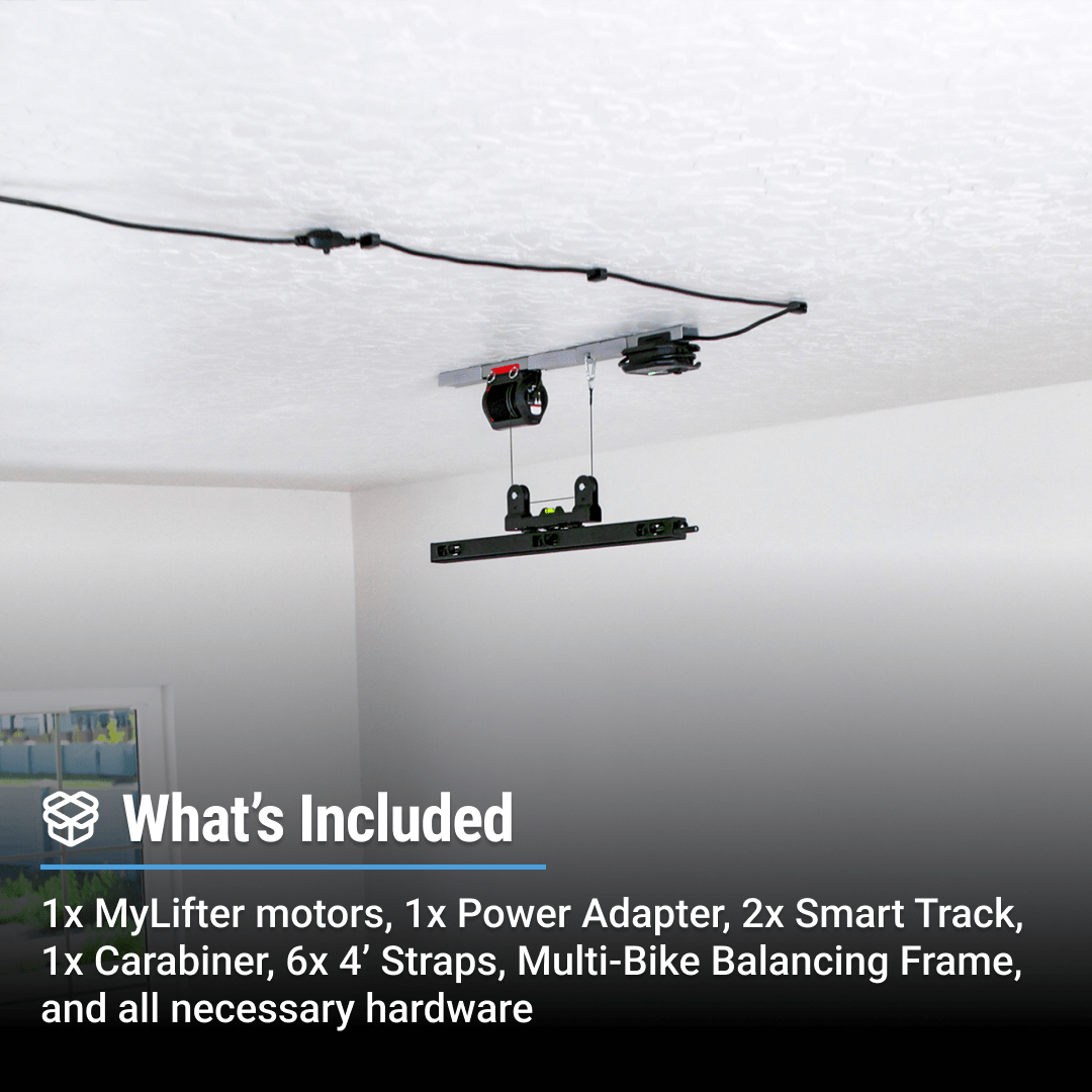 1x MyLifter, 1x Power Adapter, 1x 3' DC Cables, 1x Smart Track, Multi-Bike lifting frame, 6x 4' Adjustable straps and all needed mounting hardware.