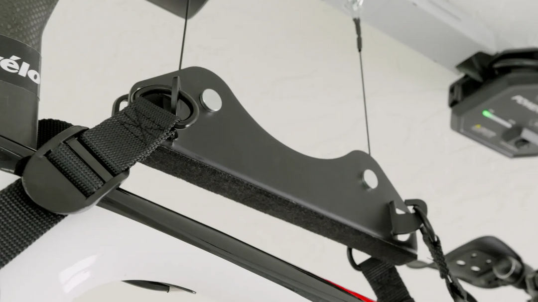 The heavy duty lifting frame has a soft touch bottom, protecting the finish on your bike. The built in lifting hooks make hanging or removing a bike quick and easy.