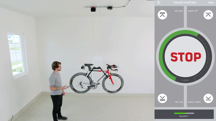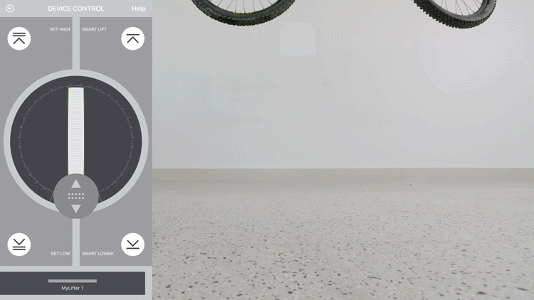 The MyLifter app’s “Smart Points" feature allows you to create automatic stopping points at your ceiling and floor. A single button press in the app automatically moves the item to the programed points.
