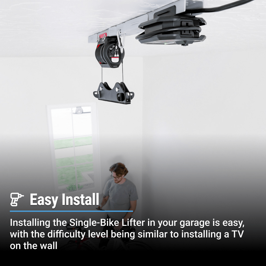 Installing the Single-Bike Lifter in your garage is easy, with the difficulty level being similar to installing a TV on the wall.